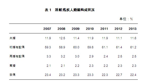 包養網2013年度,適齡殘疾包養app人在婚率為63.7%,離婚率為2.3%,與過去四年相比,婚姻狀況呈現穩定態勢(見表1)。